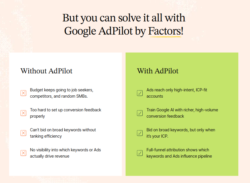 - Google AdPilot: Run better ads on Google with Google AdPilot. Google CAPI sends richer, more accurate conversion signals to Google Ads by combining click-level data, firmographics, and engagement scoring. Helps Google optimize for high-value accounts instead of low-quality leads. Google's Audience Sync enables advanced audience targeting for Google Ads. Retarget only ICP-fit accounts, suppress wasted clicks from job seekers or competitors, expand into expensive keywords with control, run buyer-stage–specific campaigns, and keep audiences fresh with daily automated updates.