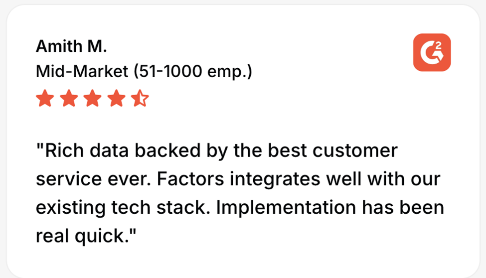 - Factors.ai - A fast-growing solution focused on ABM, intent capture, targeted advertising, and pipeline visibility, helping marketing and sales teams act on real-time buyer signals.