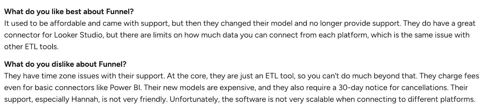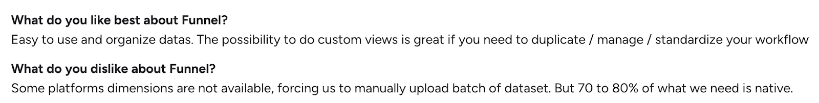 Users often highlight Funnel’s easy-to-use interface and how it streamlines multi-source reporting.