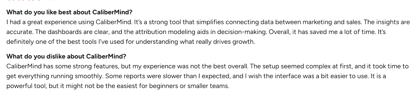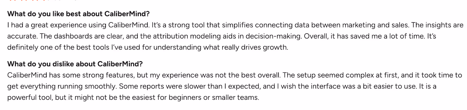 Users describe CaliberMind as powerful for attribution and data unification, and frequently call out helpful customer support.