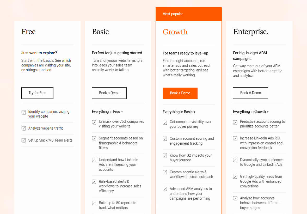 Choose Factors if you want one motion from coverage → activation → proof. It lifts account match rates with sequential enrichment, scores and routes accounts in real time, and gives sellers context through AI Agents and Account 360 timelines. Dynamic audience syncs to LinkedIn and Google keep budgets focused, while Milestones show which pages, ads, and touches push deals forward. Add GTM Engineering if you need hands-on setup and ongoing playbook tuning. The tiered, transparent pricing makes it easier to model payback against traffic and team size.