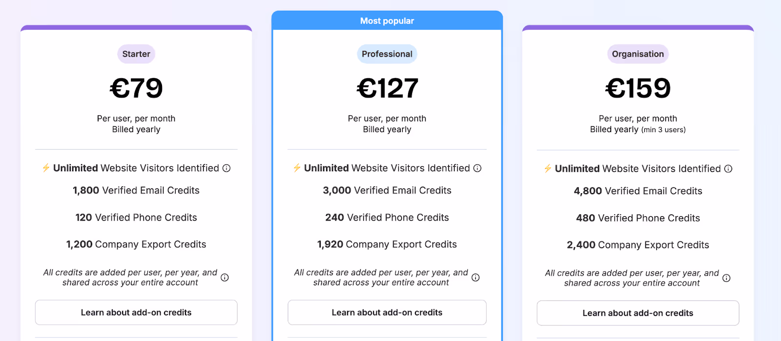 - Credits per seat/year: 3,000 verified email, 240 verified phone, 1,920 company export