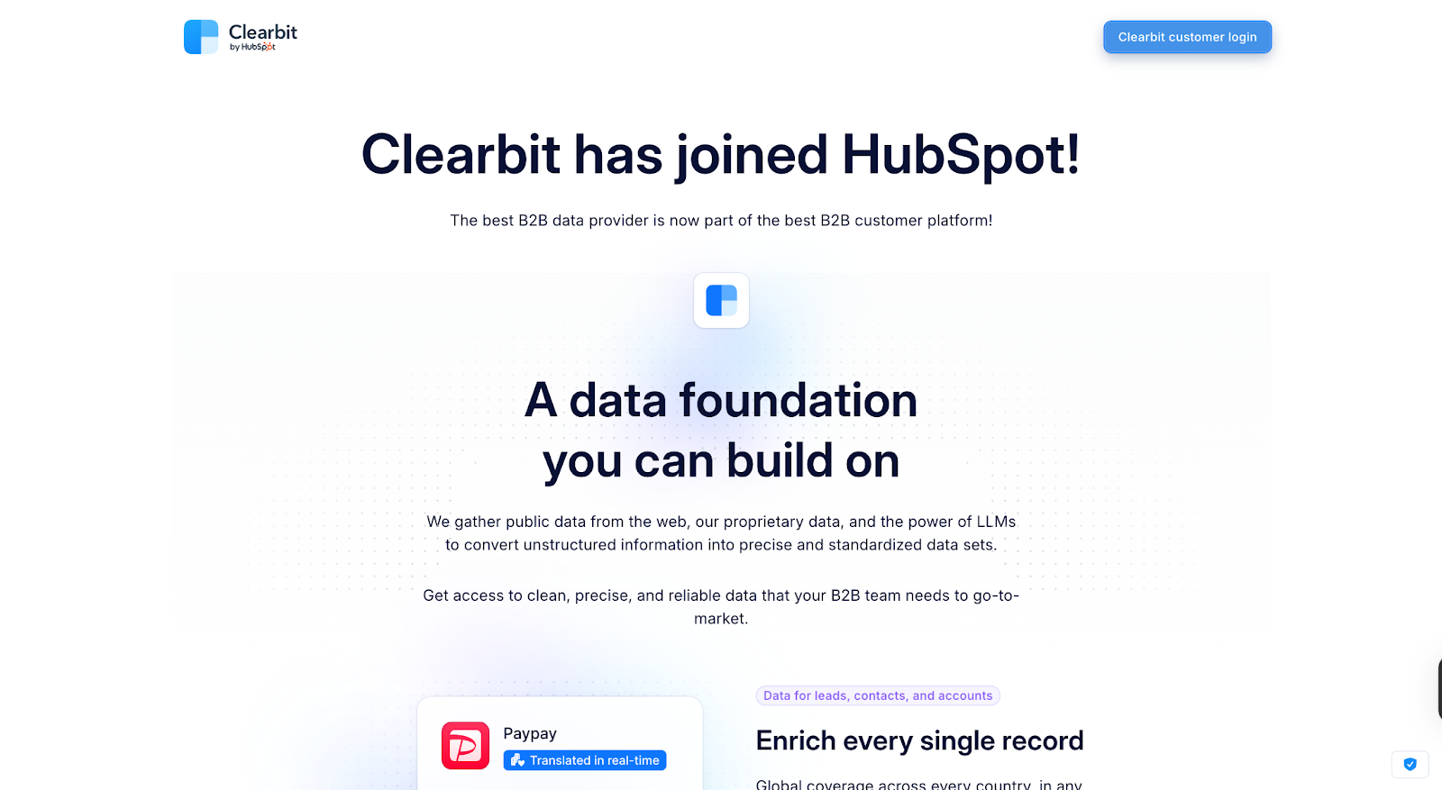 Clearbit, now a part of HubSpot, is a data enrichment platform that helps businesses get clean, reliable, and standardized customer data. It gathers information from public sources, its own proprietary data, and AI models to build precise datasets that B2B teams can use to go-to-market more effectively.