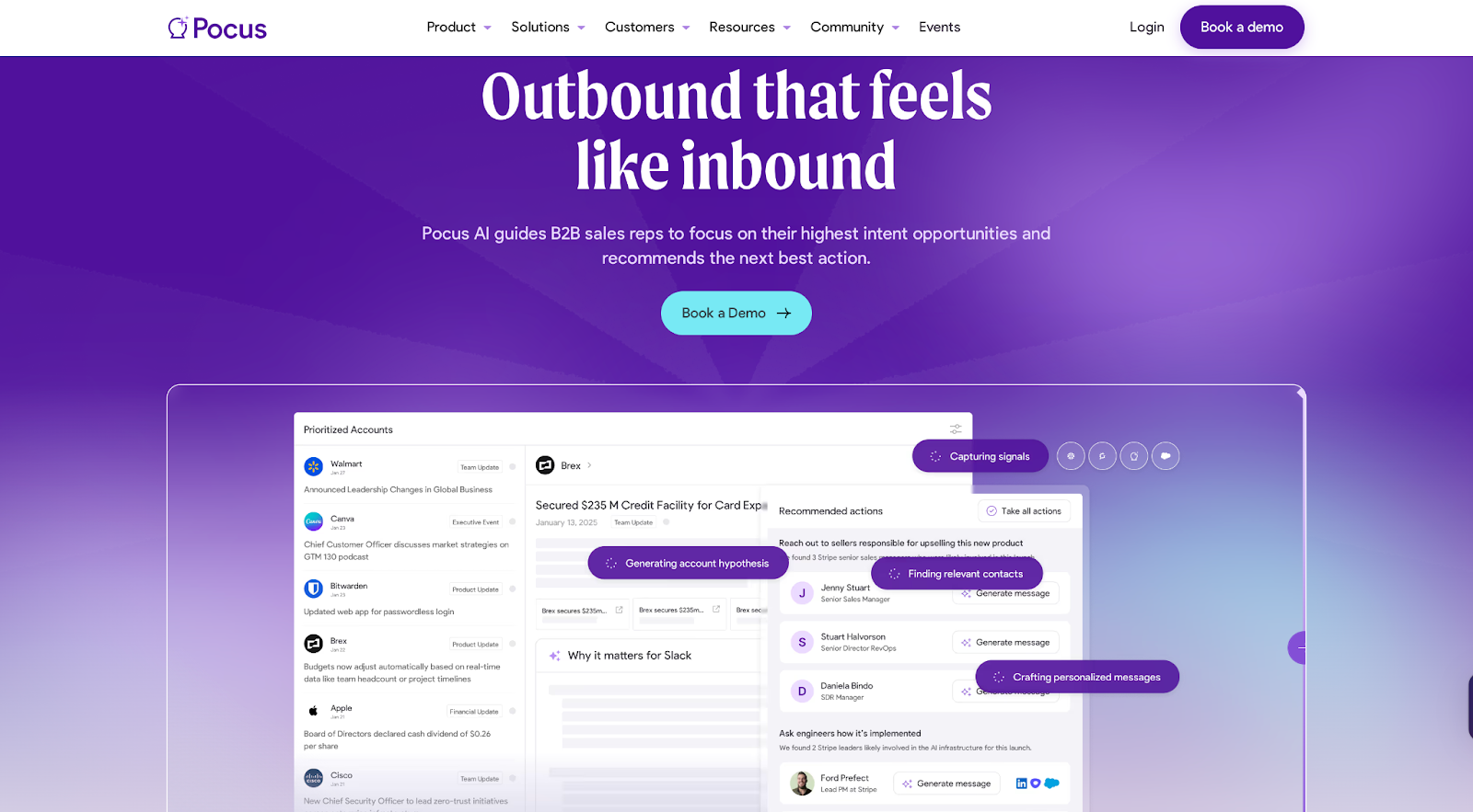 - Action Integration: Eliminates tab toggling and manual copy-pasting, allowing reps to act on insights with one click directly within Pocus.