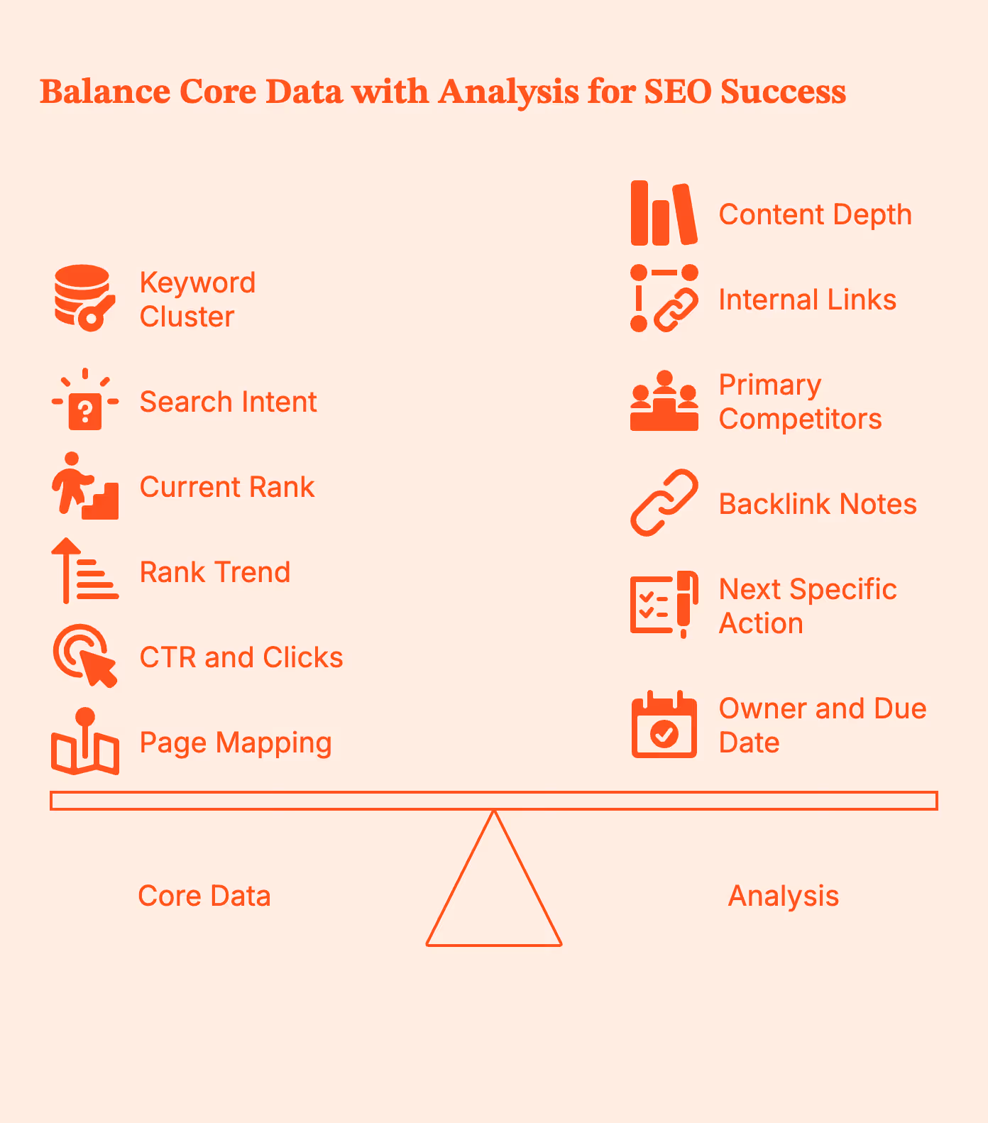- Core data: Keyword cluster (group related terms), search intent (informational/commercial/transactional), current rank, rank trend, CTR, clicks, and page mapping (which page targets this given keyword).