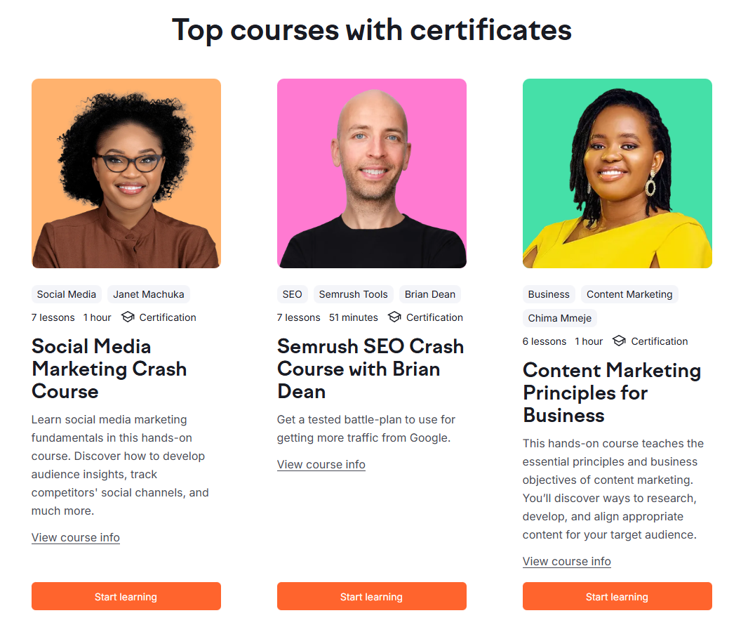 Free courses on technical SEO, keyword research, content strategy, with certificates you can actually put on your LinkedIn. And here's the genius move: the courses teach a bunch of these topics using demos of Semrush. You learn real skills, while subconsciously familiarizing yourself with the tool.