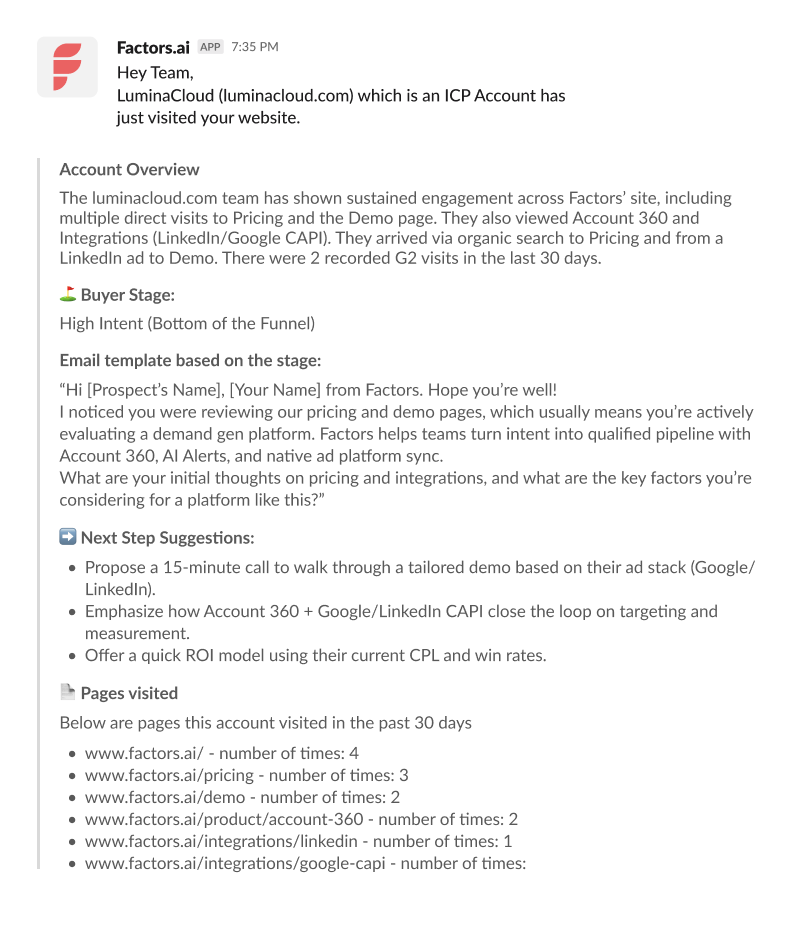 We’ve seen this happen over and over again. That’s why, at Factors, we focus on making intent data actually usable, without asking your team to change how they work. That means, your team doesn’t need to learn new tools, and go through long (and confusing) onboarding processes. Instead, we offer contextual alerts sent directly to your team's existing workspace: Slack, your CRM, or email.