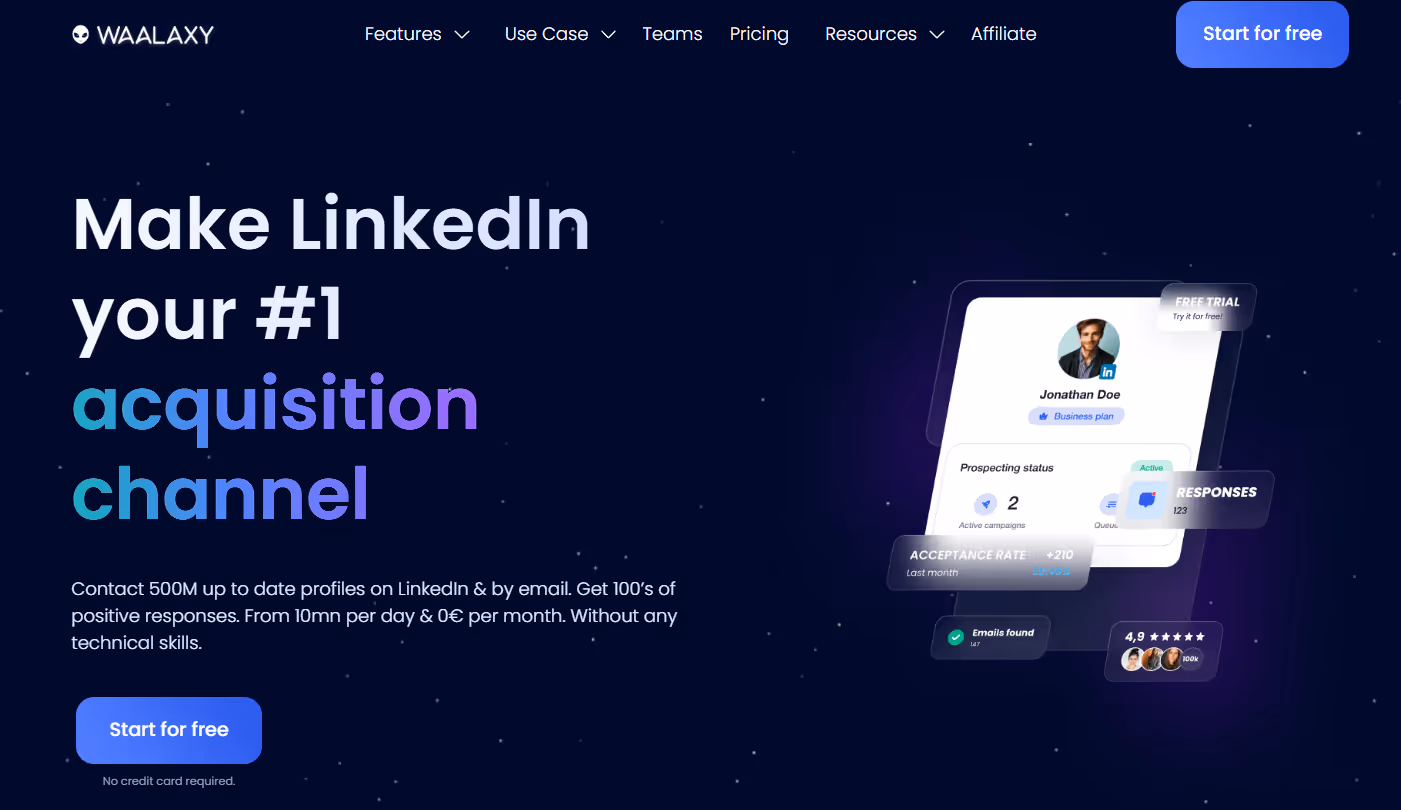 Waalaxy combines LinkedIn and email outreach into a single platform, automating connection requests, follow-ups, and multichannel campaigns with verified, GDPR-compliant contacts. Its drag-and-drop interface makes campaign building easy, while the built-in CRM keeps all interactions organized. Advanced search filters, Sales Navigator integration, and performance analytics help users identify high-quality leads, optimize engagement, and manage multiple campaigns efficiently.