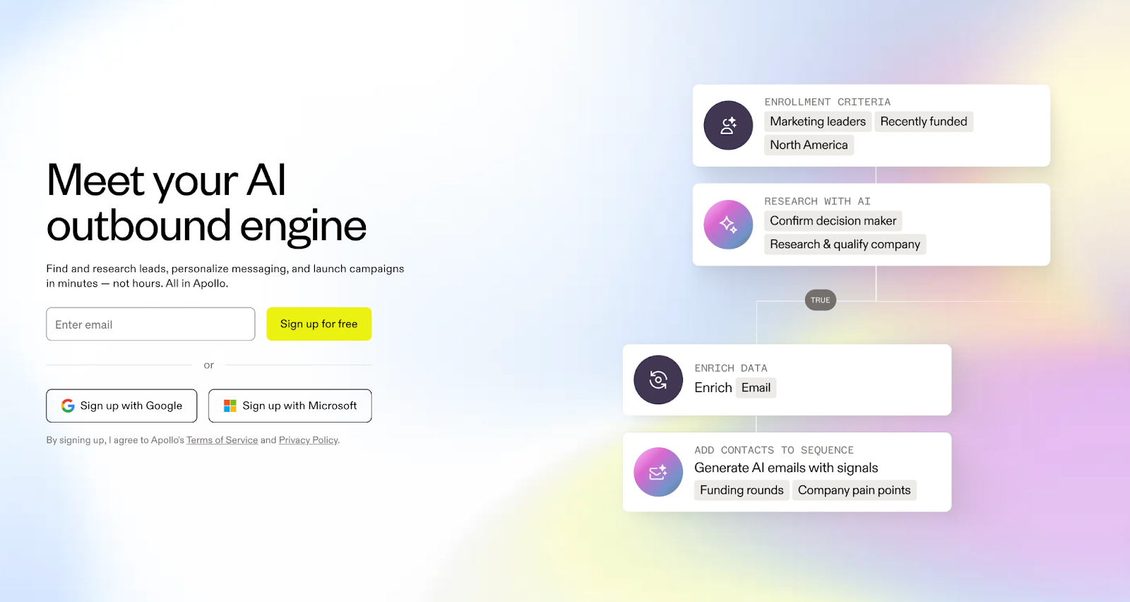 - B2B Database: Access to 210M+ contacts and 35M+ companies, powered by Apollo’s Living Data Network.
