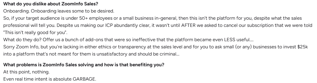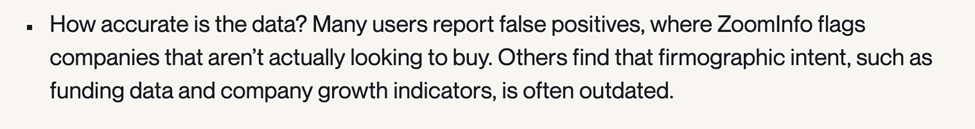 - Data inaccuracies: Some users warn that ZoomInfo’s buyer intent signals can produce false positives, flagging companies not actually in-market. They also note that both contact details and firmographic data (such as funding and growth indicators) may be outdated or inaccurate.