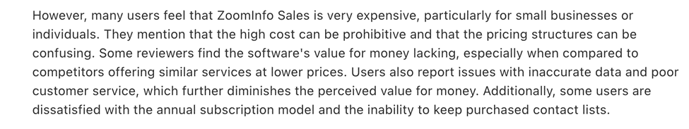 - Expensive: Organizations often find ZoomInfo expensive and its pricing structure opaque and users must contact sales to get a quote, making cost comparisons difficult.