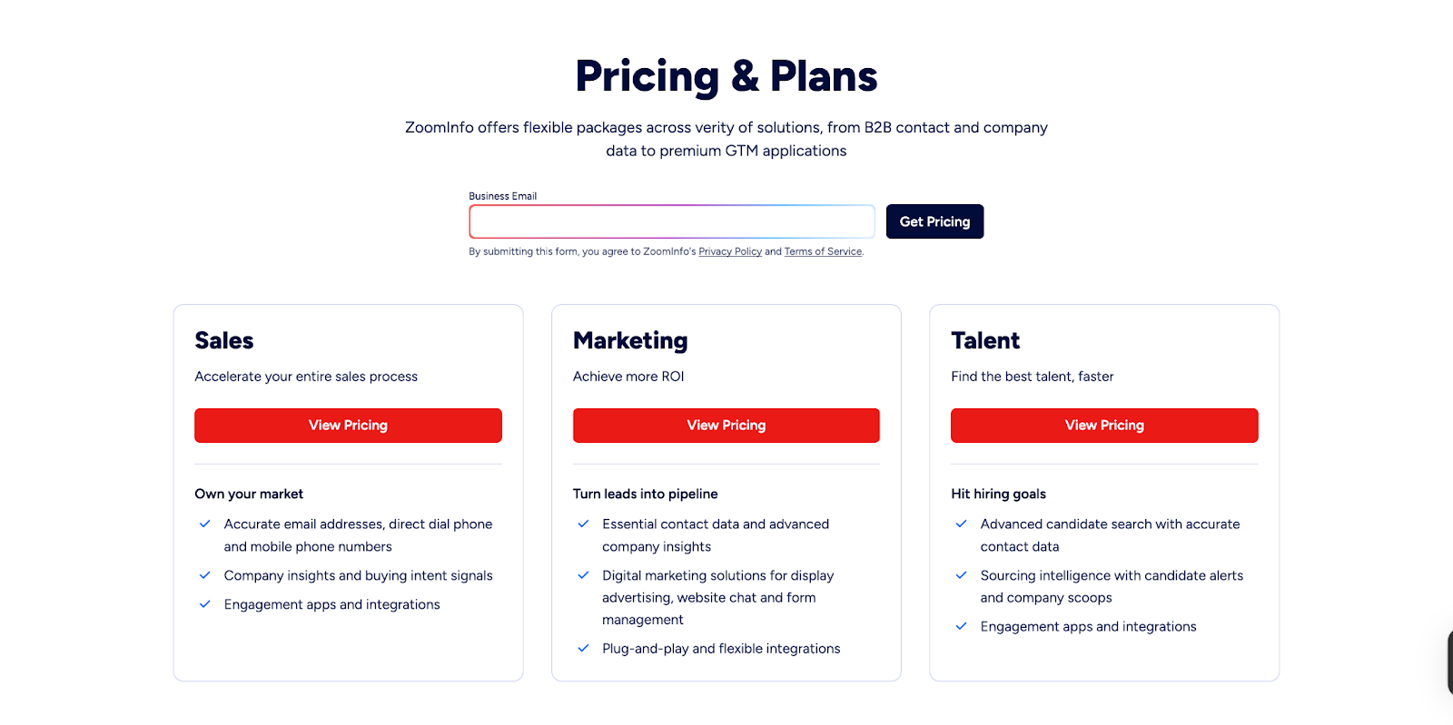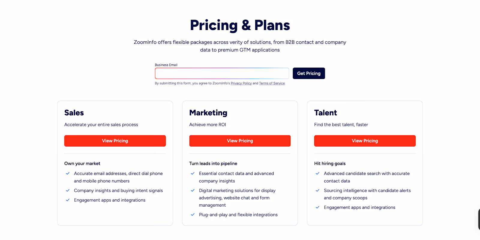 ZoomInfo does not provide pricing publicly. Its plans are organized into Sales, Marketing, and Talent Solutions, and companies need to contact ZoomInfo for a personalized quote tailored to their requirements.