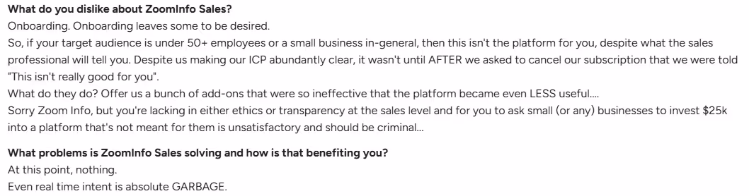 While these reviews don’t negate ZoomInfo’s strengths but do show why many teams start searching for ZoomInfo competitors that align better with their size, budget, and support expectations.