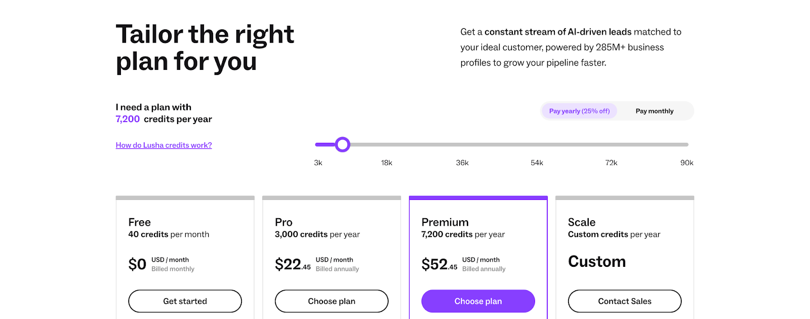 Lusha’s pricing is built around a credit-based model, meaning you only pay for what you actually use. Each plan gives you a set number of credits that can be used to unlock verified contact and company data. You can start with a free plan to test the platform, then move up to paid tiers as your prospecting scales. Here’s a quick breakdown of how each plan works.
