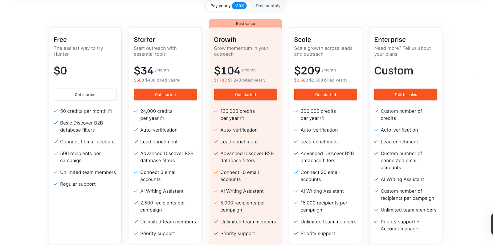 Hunter.io keeps things simple with transparent, credit-based pricing, and even offers a free plan so you can test it out before committing. Each plan gives you a set number of searches and verifications, scaling up as your outreach grows. Here’s how the pricing breaks down.
