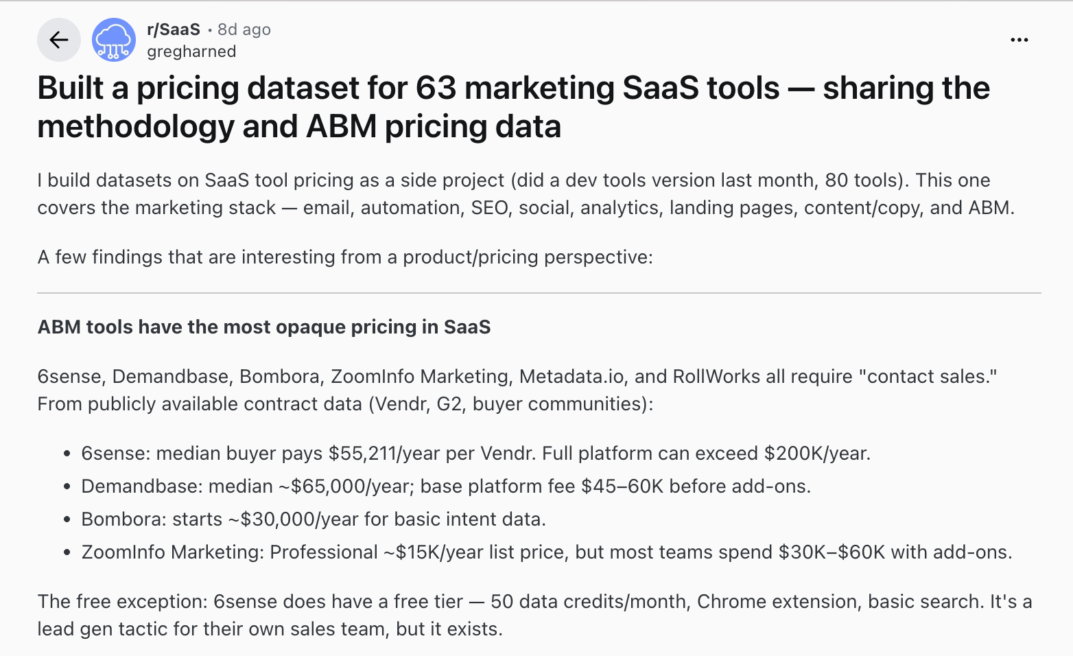 - Reddit reports real contract numbers. Across r/sales, r/SaaS, and r/SalesOperations, reported 2025–2026 contracts range from $3,000 for a single seat to $60,000+ for full-stack ABM and Intent packages. The first quote is consistently described as a negotiating anchor, not a final price.